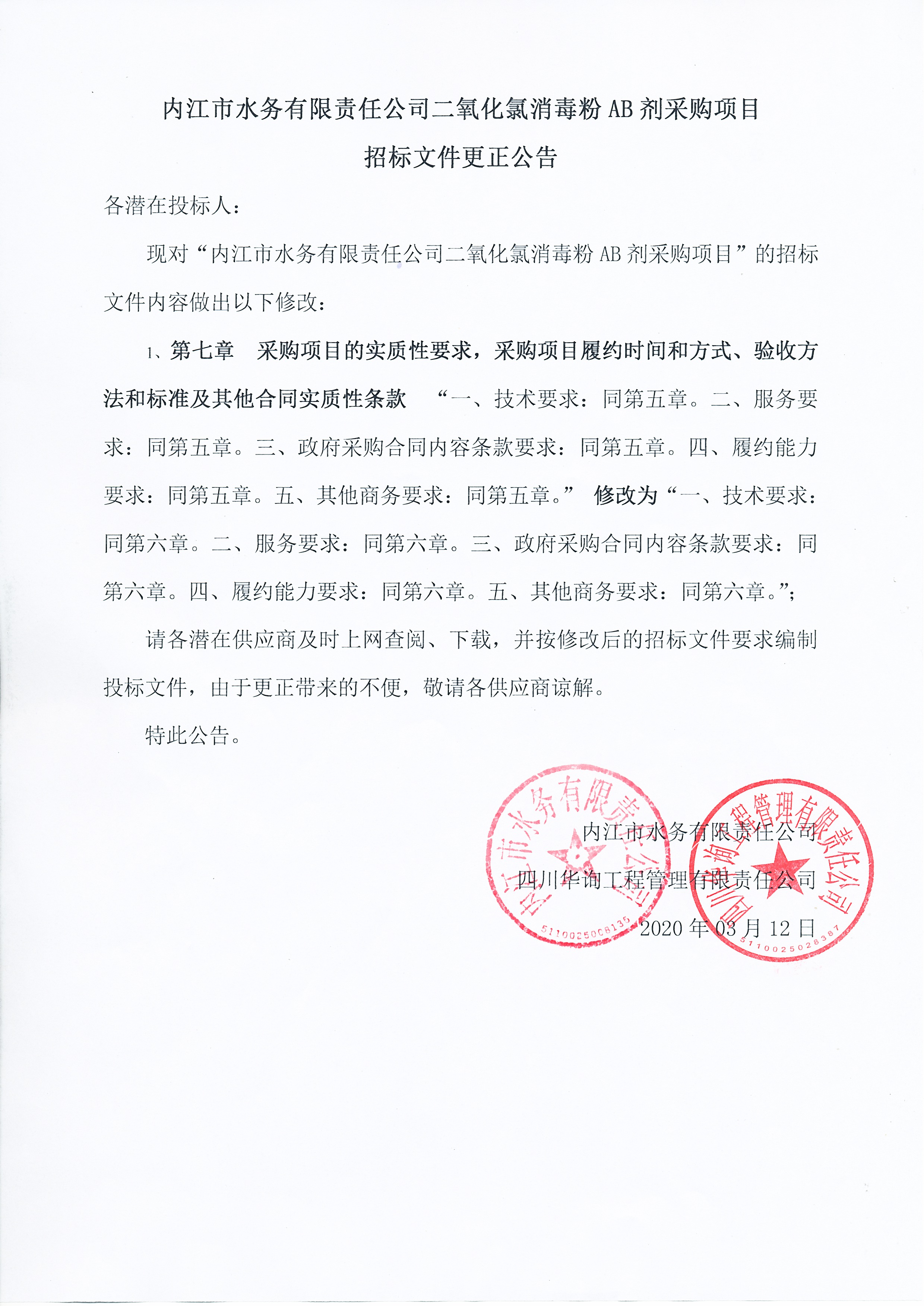 內(nèi)江市水務(wù)有限責(zé)任公司二氧化氯消毒粉AB劑采購項(xiàng)目招標(biāo)文件更正公告