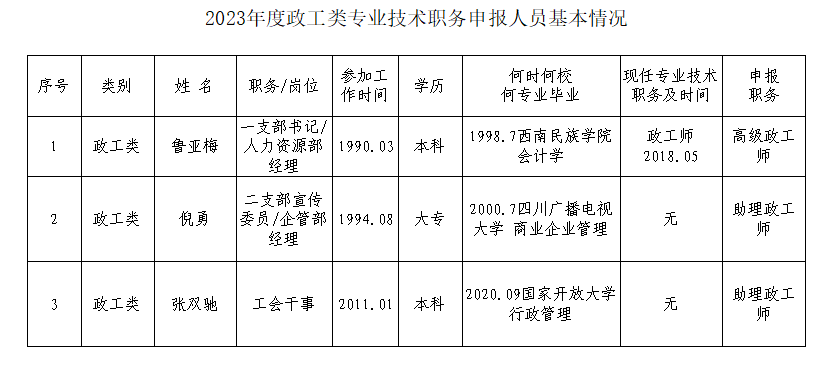 經審核,魯亞梅同志符合申報高級政工師任職資格;吳柏霖、張茜、李昊謙3名同志符合申報工程師任職資格;李斌、楊程翔、劉靈漾、李永潔、黃俊雄、曾鑫、郭炯宏7名同志符合申報助理工程師任職資格;倪勇、張雙馳2名同志符合申報助理政工師任職資格。現對其申報基本情況予以公示。公示期限自9月18日至9月22日。如有異議,請在公示期限內通過書面或其他形式向公司人力資源部反映。