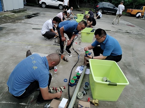 7月20日下午,二水廠維修車間門前,來自市水務(wù)公司管網(wǎng)運行部、鄉(xiāng)鎮(zhèn)供水部的11支隊伍22名技能好手,正在緊張進行著搶維修實操比賽:有的正認真識別設(shè)計圖;有的正在切割水管,熔合管道;有的已經(jīng)開始組裝管道、閥門......一個個全神貫注,顧不上汗水模糊了眼睛,浸濕了衣裳。這是公司開展搶維修技能競賽上實際操作環(huán)節(jié)的一個場景。