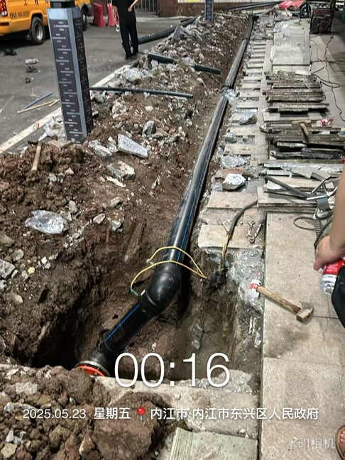 搶修現場,維修人員面對夜間視線不佳、高溫作業、現場環境復雜等多重挑戰,爭分奪秒、迎難而上,通宵達旦開展搶修工作。次日凌晨3點58分,維修人員熊弈在工作群里發布消息:“東興區政府DN150鋼管因漏點在建筑下方無法維修,已從旁改管繞過漏點,160PE管改管約60米,63PE管改30米,加裝50銅閘閥一只,現已修復通水。”至此,搶修工作圓滿結束,恢復正常供水。