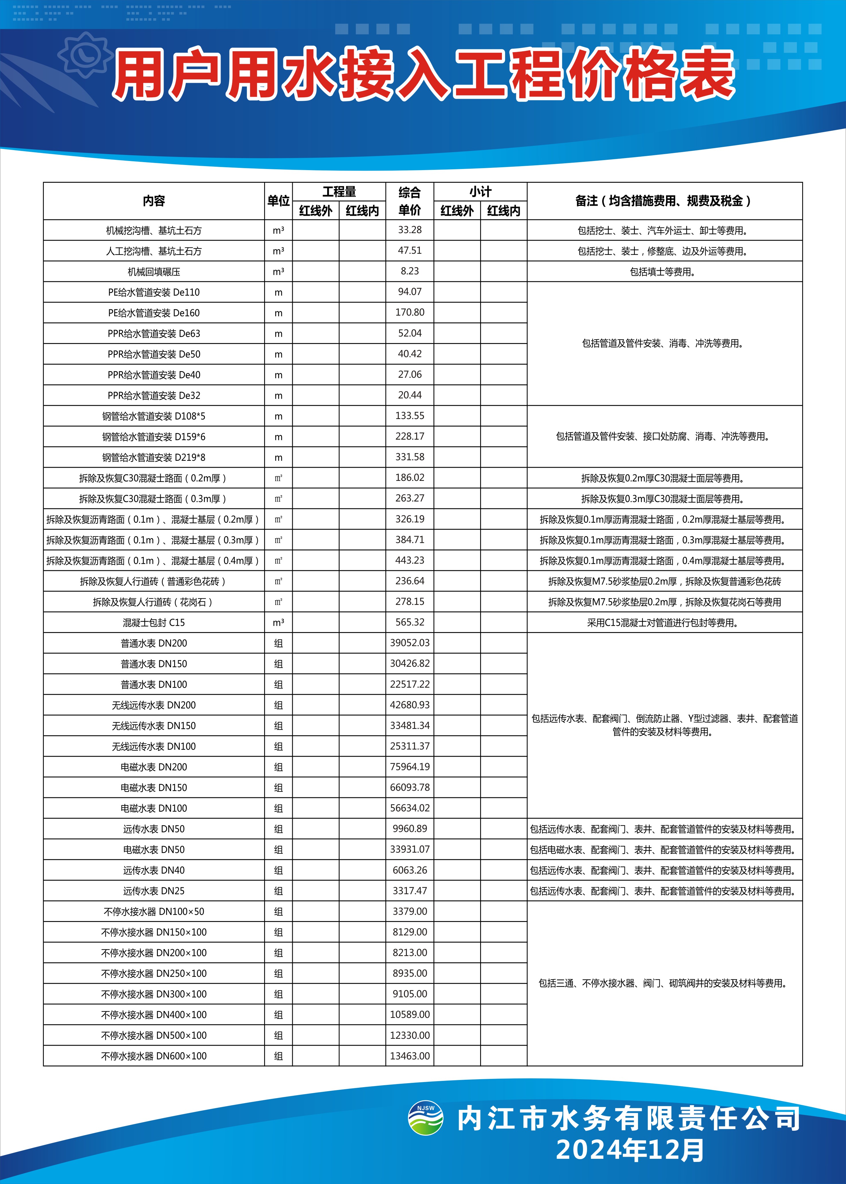 內江市水務有限責任公司用戶用水接入工程價格表